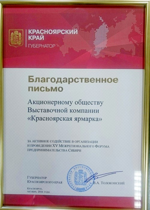 В день закрытия Форума по традиции состоялось вручение благодарственных писем от губернатора края Виктора Толоконского компаниям, внесшим вклад в развитие регионального предпринимательства и организацию форума. Отдельную благодарность от губернатора получила выставочная компания «Красноярская ярмарка» — за активное содействие в организации и проведении XV Межрегионального Форума предпринимательства Сибири.