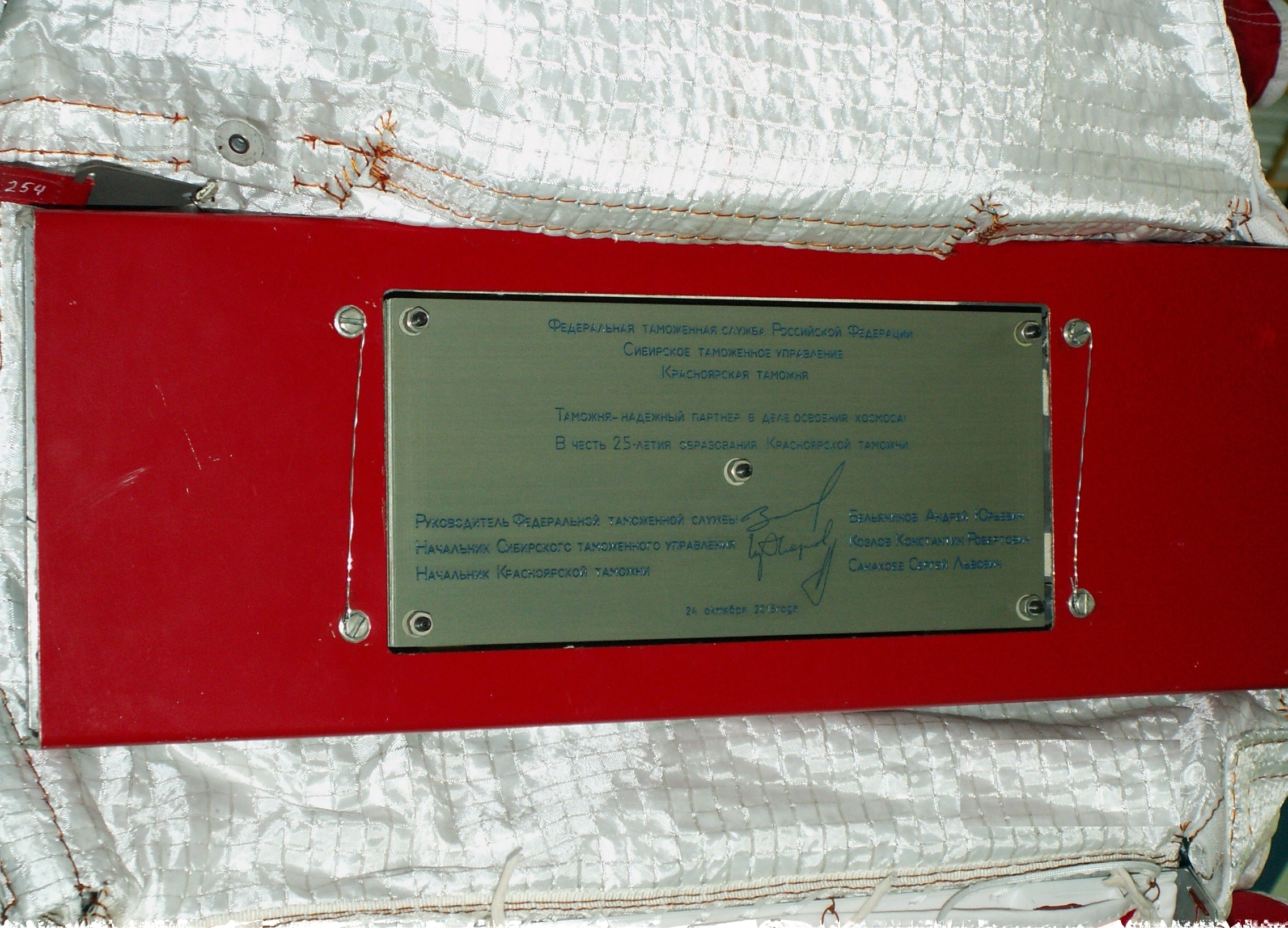 Как сообщили в пресс-службе Красноярской таможни, табличка была изготовлена в честь 25-летнего юбилея ведомства. Запуск спутника в космос состоялся еще 25 мая, а на днях в Красноярской таможне состоялось торжественное вручение копии этой таблички — она пополнит экспозицию уголка истории местных таможенников. Отметим, что аналогичную табличку отправляли в космос в 2005 году, в честь 15-летия таможни.