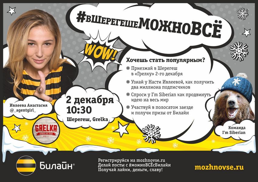 «Билайн» в рамках проекта #МожноВСЁ организует в баре «Grelka» в Шерегеше встречу с известным инстаграм-блогером Настей Ивлеевой. На её страницу _agentgirl_ подписано более 2,3 млн человек, каждый пост получает сотни тысяч лайков, а публикуемые видео собирают по 2 млн просмотров.