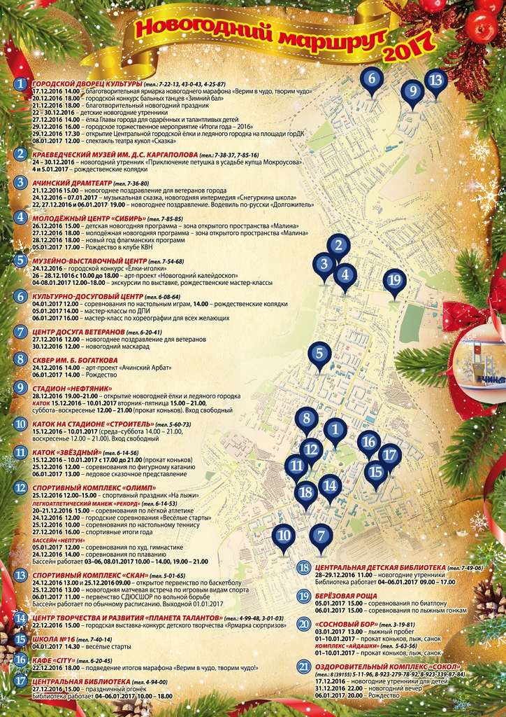 Специалисты отдела культуры администрации Ачинска разработали дорожную памятку по праздничным новогодним мероприятиям. В маршруте 21 остановка и более 60 крупных городских событий, которые пройдут с 15 декабря по 9 января.
