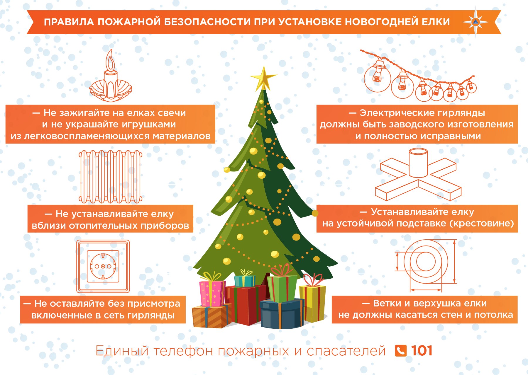 В ГУ МЧС по краю добавили, что ёлка должна стоять на некотором расстоянии от электрических приборов, стен и не касаться потолка. В месте, где будет установлена ель, следует убрать ковровые покрытия. Украшать ёлку рекомендуют только качественными игрушками и гирляндами, отказавшись от украшений из ваты, бумаги, а также свечей. Возле новогодней ёлки не следует зажигать бенгальские огни и пользоваться хлопушками, уходя из дома гирлянду на дереве необходимо выключить.