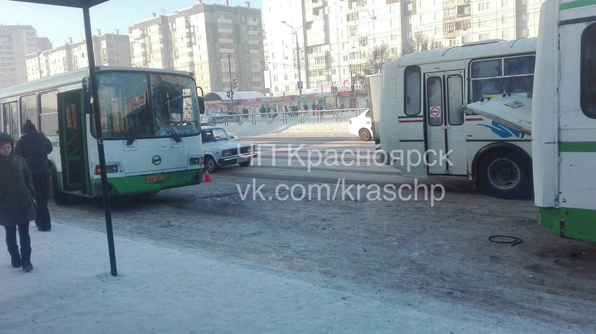 В красноярском микрорайоне Северный в результате столкновения двух маршрутных автобусов пострадала беременная. Как сообщили очевидцы, ДТП произошло сегодня на ул. 9 Мая, на остановке «Детская поликлиника».