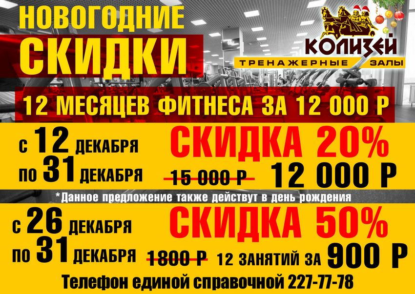 «Не знаете, что подарить на Новый год? „Колизей“ поможет с выбором не только приятного, но еще полезного и практичного подарка. В наших залах можно приобрести подарочные сертификаты номиналом 1500, 1800, 2000 и 15000 рублей. Друзья и близкие, которые придумывали сотни отговорок для похода в тренажерный зал, получив такой сертификат, скажут вам спасибо. Ведь видеть свое стройное и мускулистое тело в зеркале так приятно!» — рассказал маркетолог «Колизея» Алексей Гаялов.