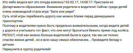 За последние несколько дней в социальных сетях массово стали появляться рассылки, предупреждающие родителей о новой опасной игре их детей. Якобы школьники устраивают соревнования, перебегая дорогу прямо перед движущимся транспортом. Авторы сообщений призывают водителей к внимательности, а родителей — просят провести дополнительные беседы с детьми. Сообщения рассылаются по всем городам России.