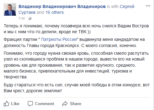 Депутат Красноярского горсовета и ресторатор Владимир Владимиров будет баллотироваться на пост главы Красноярска. Об этом он написал на своей странице в Facebook.