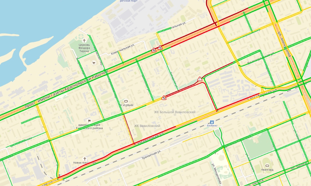 Кроме этого, со вчерашнего вечера на пр. имени газеты «Красноярский рабочий» перекрыли движение в районе остановки «Кинотеатр «Родина». Автомобилисты не смогут проехать по правой полосе в сторону Предмостной площади от ул. Корнетова до ул. Шелковая. Авария на ул. Вавилова еще сильнее осложнила дорожную обстановку в этом районе.