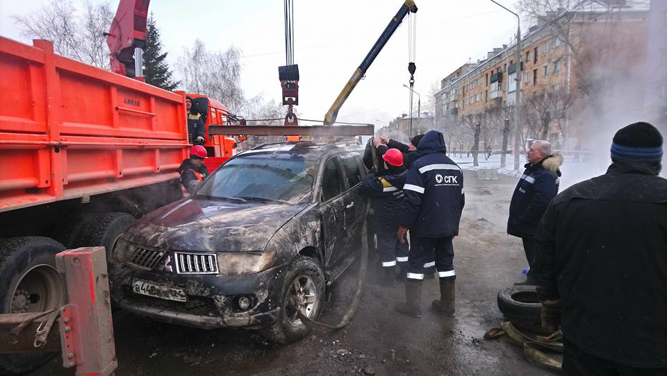 Авария в Кировском районе Красноярска произошла сегодня около восьми часов утра. Сначала проезжую часть начал заливать кипяток, а затем в образовавшийся на дороге провал упал автомобиль Mitsubishi. Как сообщил приехавший на место происшествия глава города Сергей Ерёмин, в машине находилась беременная женщина, которую доставили в больницу. У нее сильный испуг, но никаких повреждений нет.