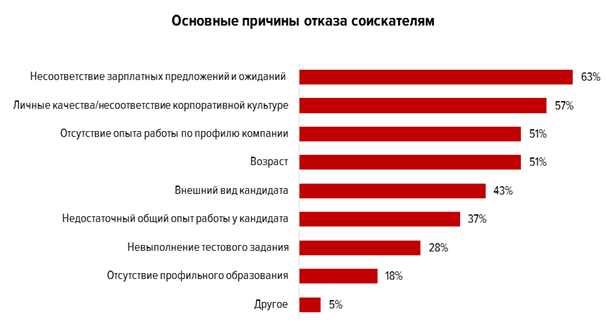 Больше половины работодателей (57 %) отказывают из-за личных качеств человека. Кроме профессиональных компетенций требуются стрессоустойчивость, развитые коммуникативные навыки, умение работать в режиме многозадачности и т. д.