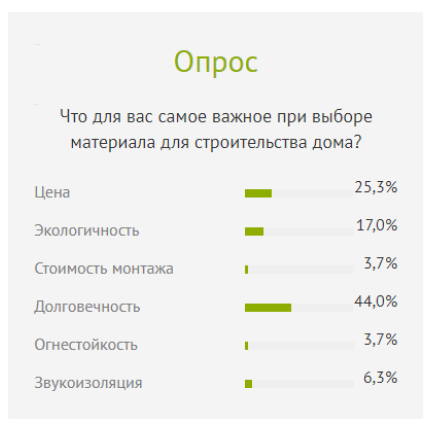 По итогам опроса на тему «Что для вас самое важное при выборе материала для строительства дома?», который проходил на сайте Newslab с 9 по 15 сентября, 43,8% красноярцев проголосовали за долговечность. 25,8% в первую очередь посмотрят на цену. Для 17,2% опрошенных важно, насколько материал экологичный. Это три наиболее популярных ответа.