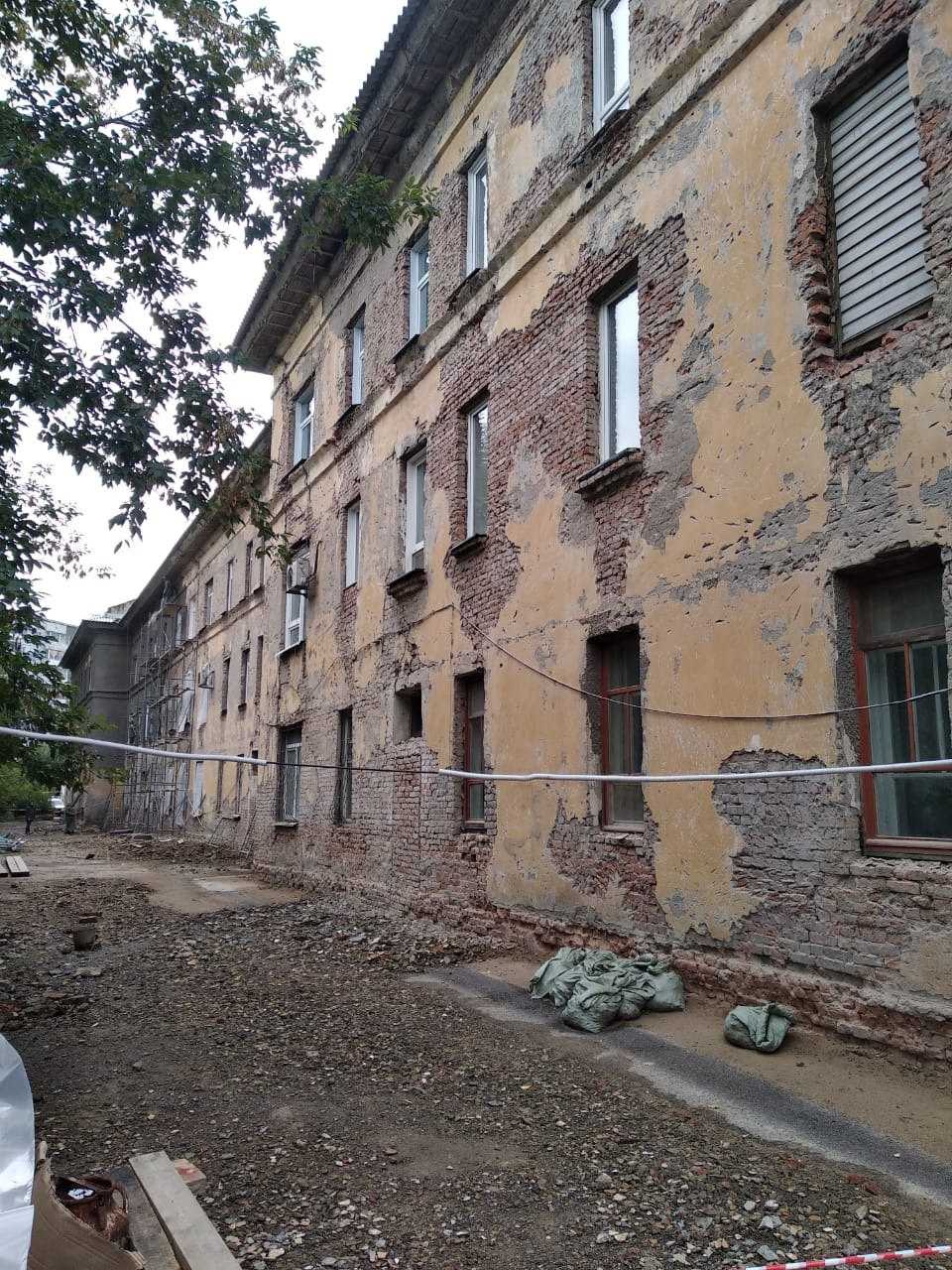 Речь идет о доме № 4 на улице Малиновского. В здании сейчас идет капитальный ремонт и утепление фасада, который должен закончится 29 сентября. Рабочие сняли с дома старую штукатурку. После этого стало понятно, что одна из стен держится «на честном слове». Фрагмент стены с оконными блоками первого и второго этажа просел, по обе стороны от окон от фундамента до крыши протянулись широкие трещины. Из-за этого в здании вчера экстренно отключили газ.