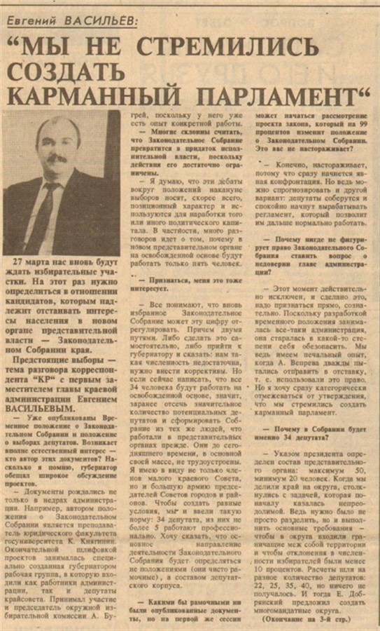 Евгений Васильев, первый заместитель главы краевой администрации: «Почему в Собрании будет именно 34 депутата? Указом Президента определен состав представительного органа: максимум 50, минимум 20 человек. Когда мы делили край на округа, столкнулись с задачей, которая поначалу казалась непреодолимой. Ведь нужно было не просто разделить, но и выполнить основные требования — чтобы в округа входили граничащие между собой территории и чтобы отклонения в численности избирателей были менее 10 процентов... За основу взято равное право представительства, т.к. избирательные округа оказались примерно равны».