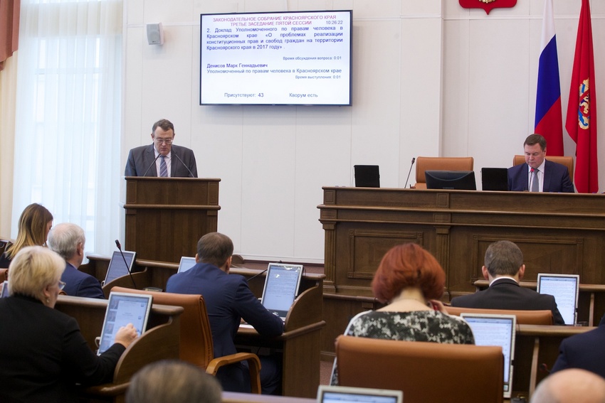 Марк Денисов рассказал парламентариям, что в прошлом году количество обратившихся за помощью к уполномоченному составило 4 137 человек, что на 123 больше, чем годом ранее. Еще 1 914 жителей приняли представители омбудсмена в городах и районах Красноярского края. Больше всего жители жаловались на силовиков (22 % обратившихся).